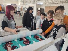 Следующим занятием стал мастер-класс на базе Компании TÜLENEVA — премиальном швейном производстве одежды и аксессуаров для взрослых и детей. Ирина Тюленева показала свою мастерскую, оснащённую современным оборудованием. Ребята познакомились с работой станка для печатания рисунка на ткани. Этот станок позволяет создавать уникальные и оригинальные принты на различных видах тканей, в том числе с индивидуальным дизайном. Участники проекта, с большим вниманием наблюдали за работой станка, так как занятия в «швейной мастерской» предусматривают работу с термопрессом.