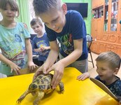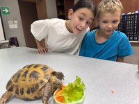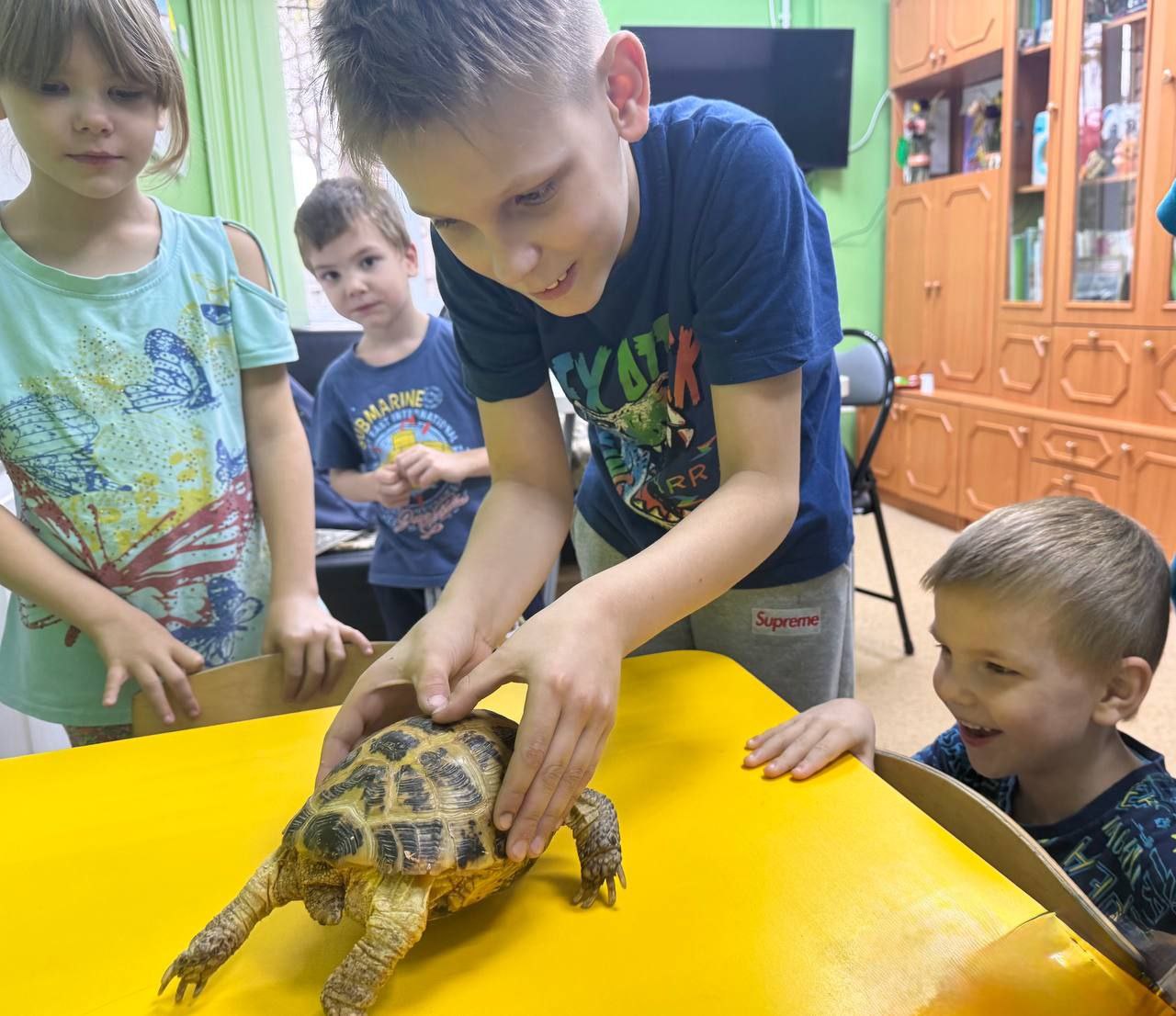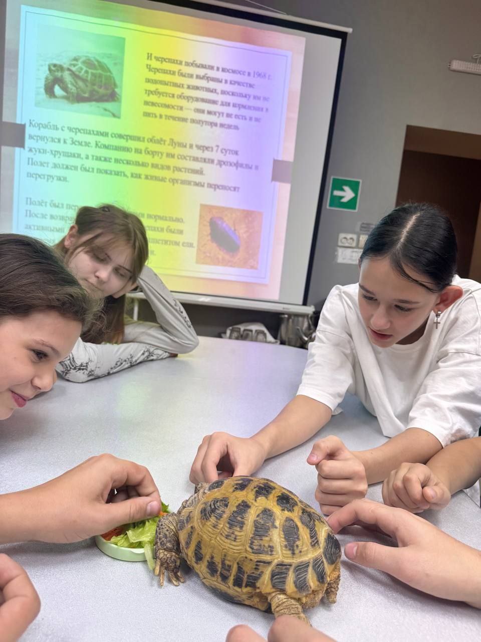 Теоретические знания тут же нашли свое практическое воплощение. Настоящим сюрпризом для ребят стала встреча с живой среднеазиатской сухопутной черепахой, любезно предоставленной «ОЦЭКИТ». Дети не только смогли рассмотреть удивительное животное вблизи, но и узнать о его повадках, среде обитания и уникальных особенностях. Этот живой контакт вызвал настоящий восторг и стал для ребят своеобразным «мостиком» к новым открытиям.