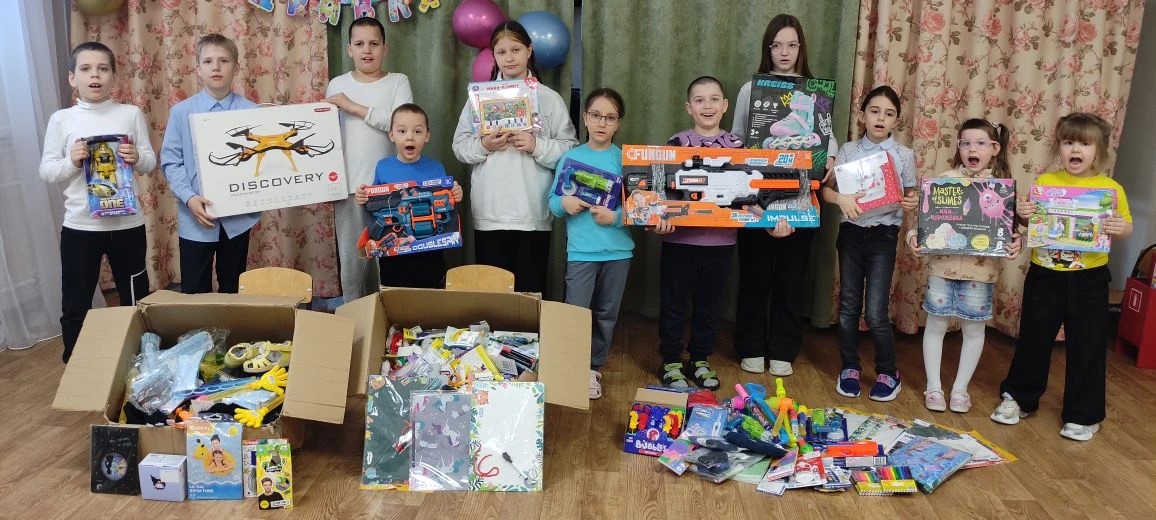 Ребята с нетерпением и неподдельным восторгом разбирали коробки, и каждый нашел что-то по душе! Для самых маленьких были приготовлены классические игрушки – пистолеты, куклы и швейный набор, которые мгновенно стали центром внимания и положили начало веселым играм.