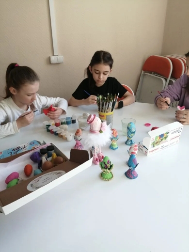 В рамках практической части занятия воспитанники центра изготовили праздничные пасхальные яйца, используя разнообразные техники и материалы, украшение стразами, бусинами, лентами, кружевом. Работа акриловыми красками, создание узоров и надписей, использование текстиля, фоамирана, природных материалов.